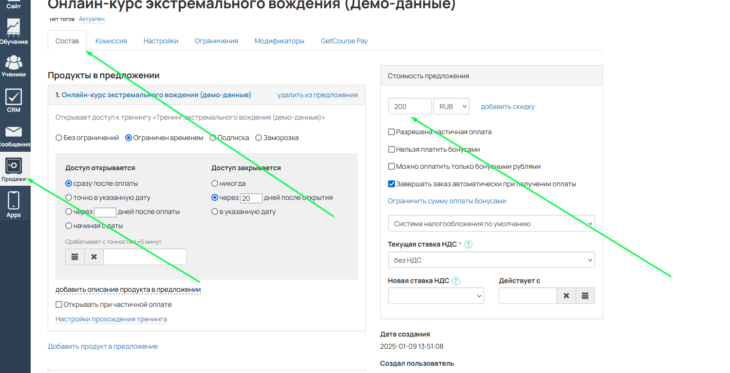 GetCourse -> Продажи -> Настройки -> Состав -> Указать и скопировать цену.