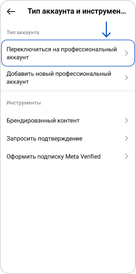 Выберите "Переключиться на профессиональный аккаунт"