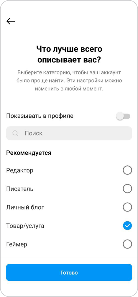 Выберите категорию, которая лучше всего описывает ваш род деятельности и нажмите "Готово"