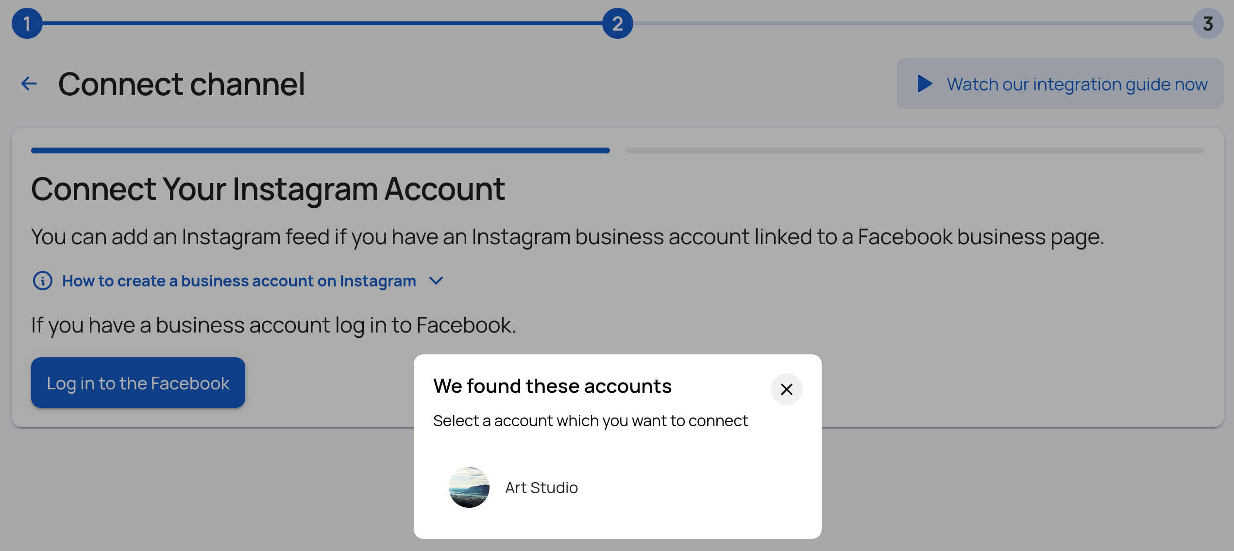 - Выберите бизнес-аккаунт Instagram, для которого добавляете канал и нажмите «Далее».