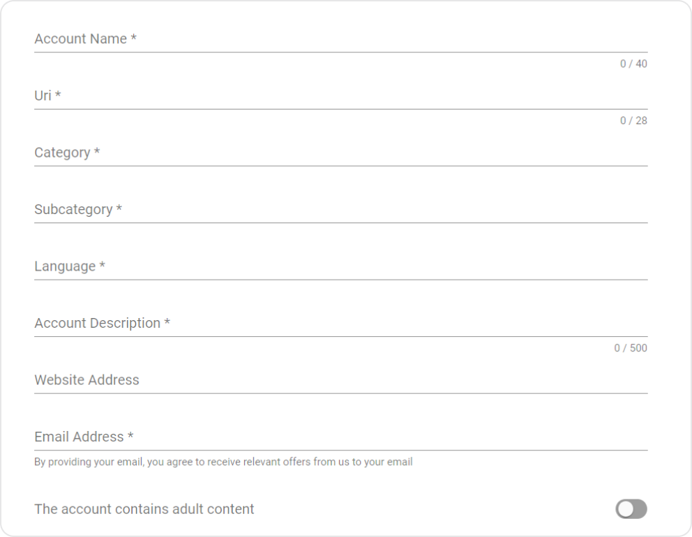 - Заполните все необходимые поля: добавьте аватар, имя, категорию и подкатегорию вашего бизнеса, язык, описание бота, адрес сайта (по желанию), ваш email и страну. Не включайте пункт "The account contains adult content", если в вашем боте нет взрослого контента. Иначе у каждого подписчика будет запрашиваться подтверждение, что ему есть 18 лет.