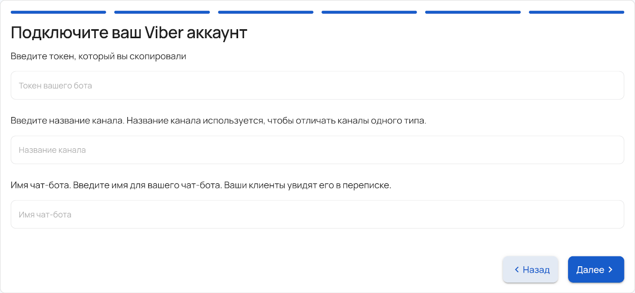 - В Athena перейдите в раздел каналы, нажмите “Добавить канал”, выберите Viber, введите токен, который вы скопировали, название канала, имя чат-бота и нажмите “Далее”.