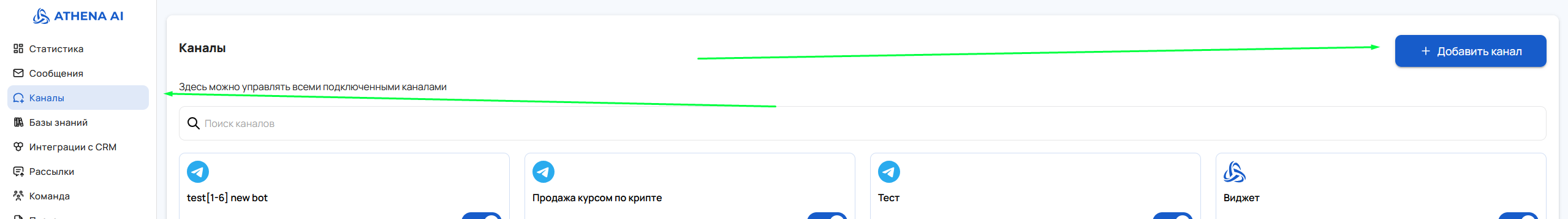 1. В личном кабинете Афины перейдите в раздел каналы -> Добавить канал