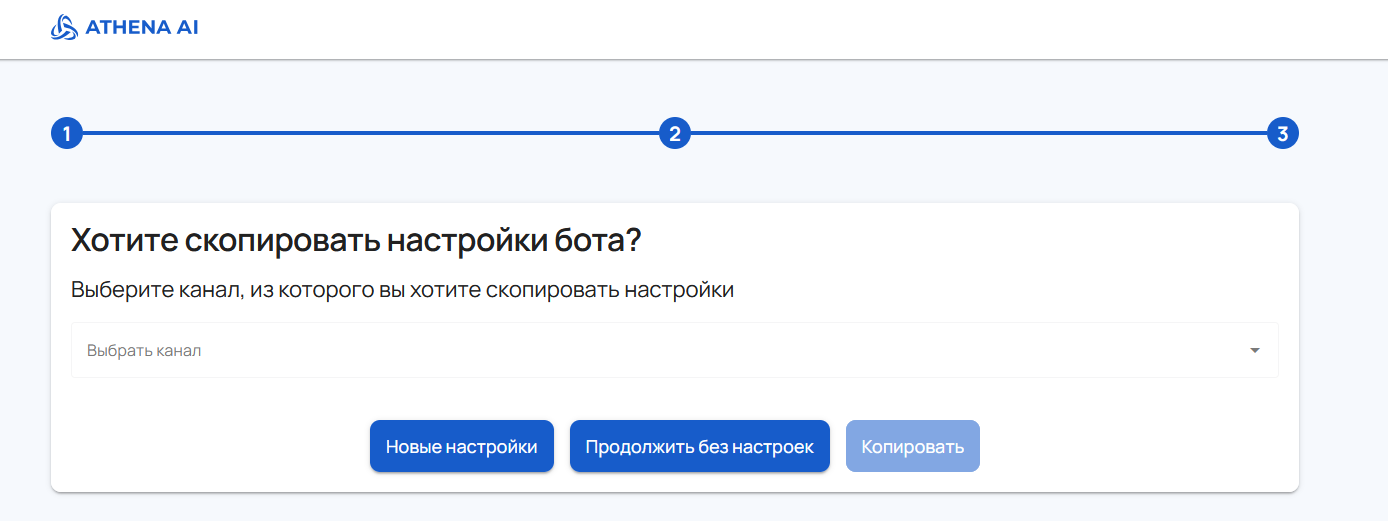 3. На данном этапе нужно выбрать бота (раннее создан), сразу же создать нового (Новые настройки), либо выбрать «Продолжить без настроек».