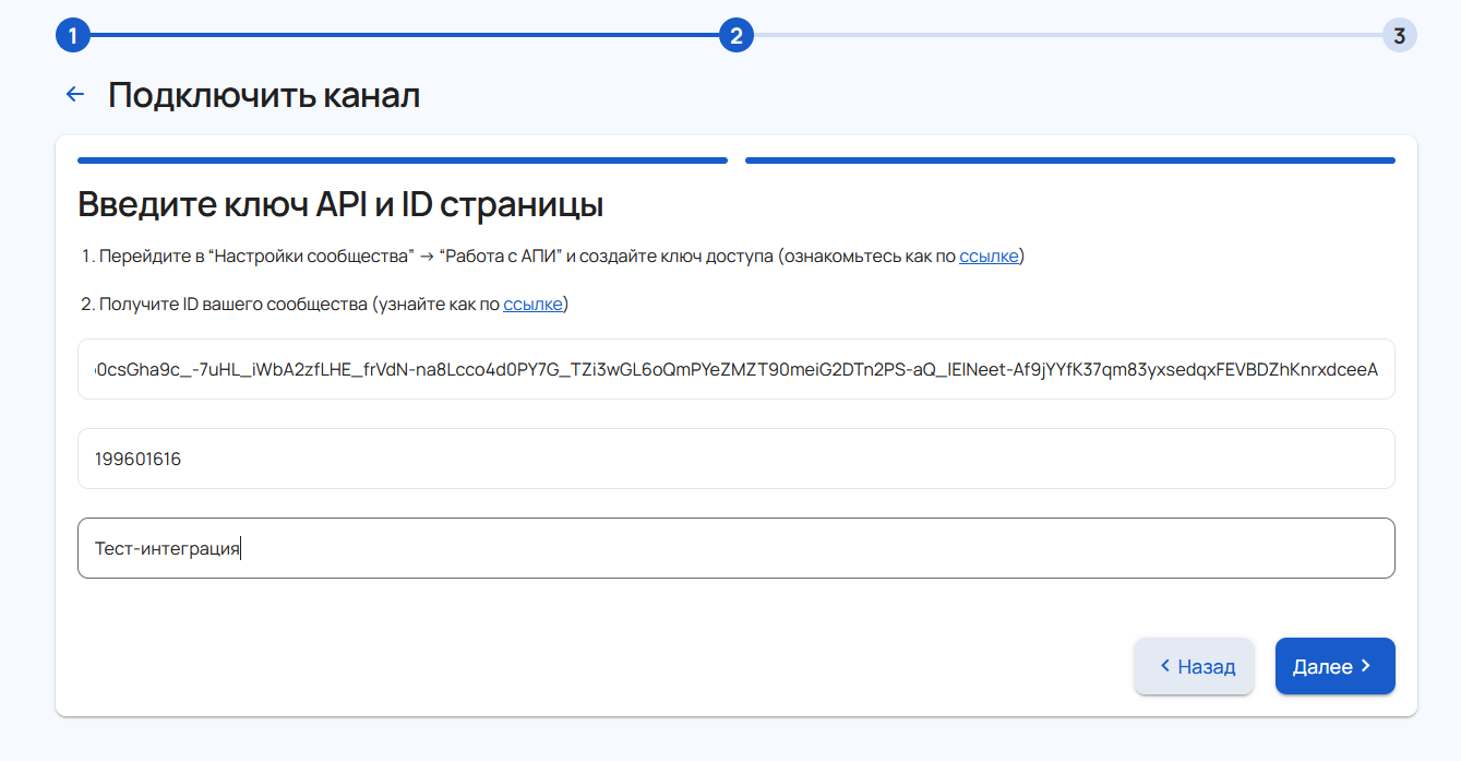 На данном этапе нужно добавить ID, API вашей группы Вконтакте.