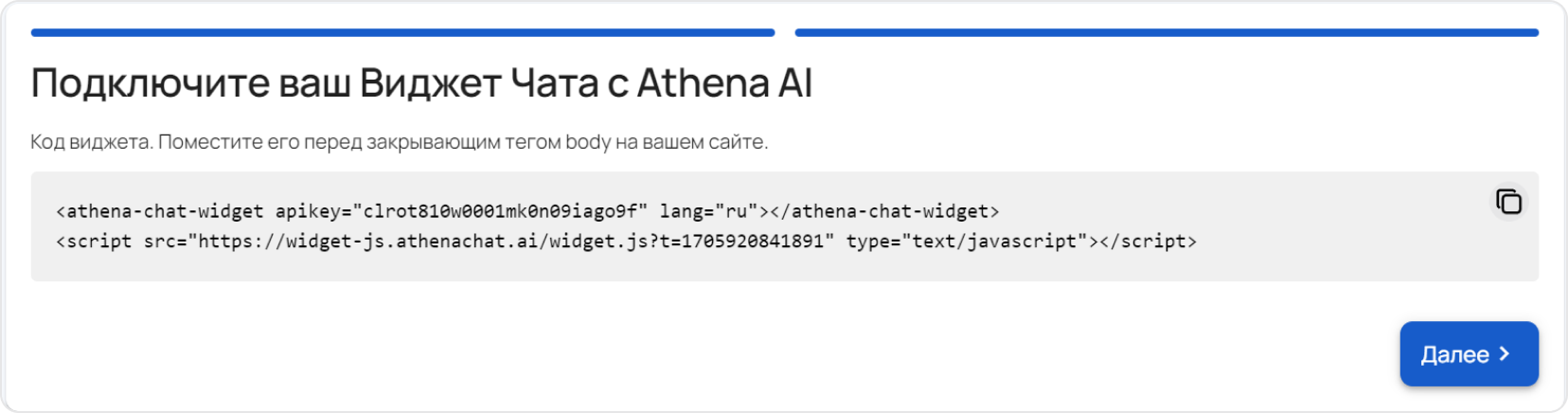 - Скопируйте код виджета. Поместите его перед закрывающим тегом body на вашем сайте. И нажмите “Далее”.